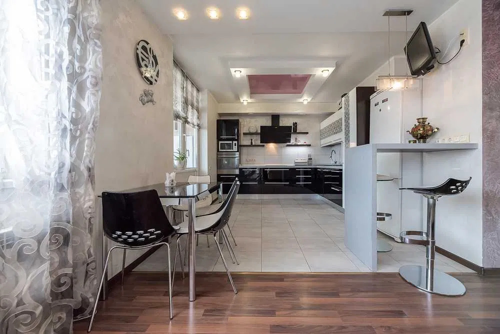 Величезна кухня-студія ( 40м2), що займає більше третини квартири: місце для сімейних сніданків та гостьових свят, ігор з дітьми і навіть танців.